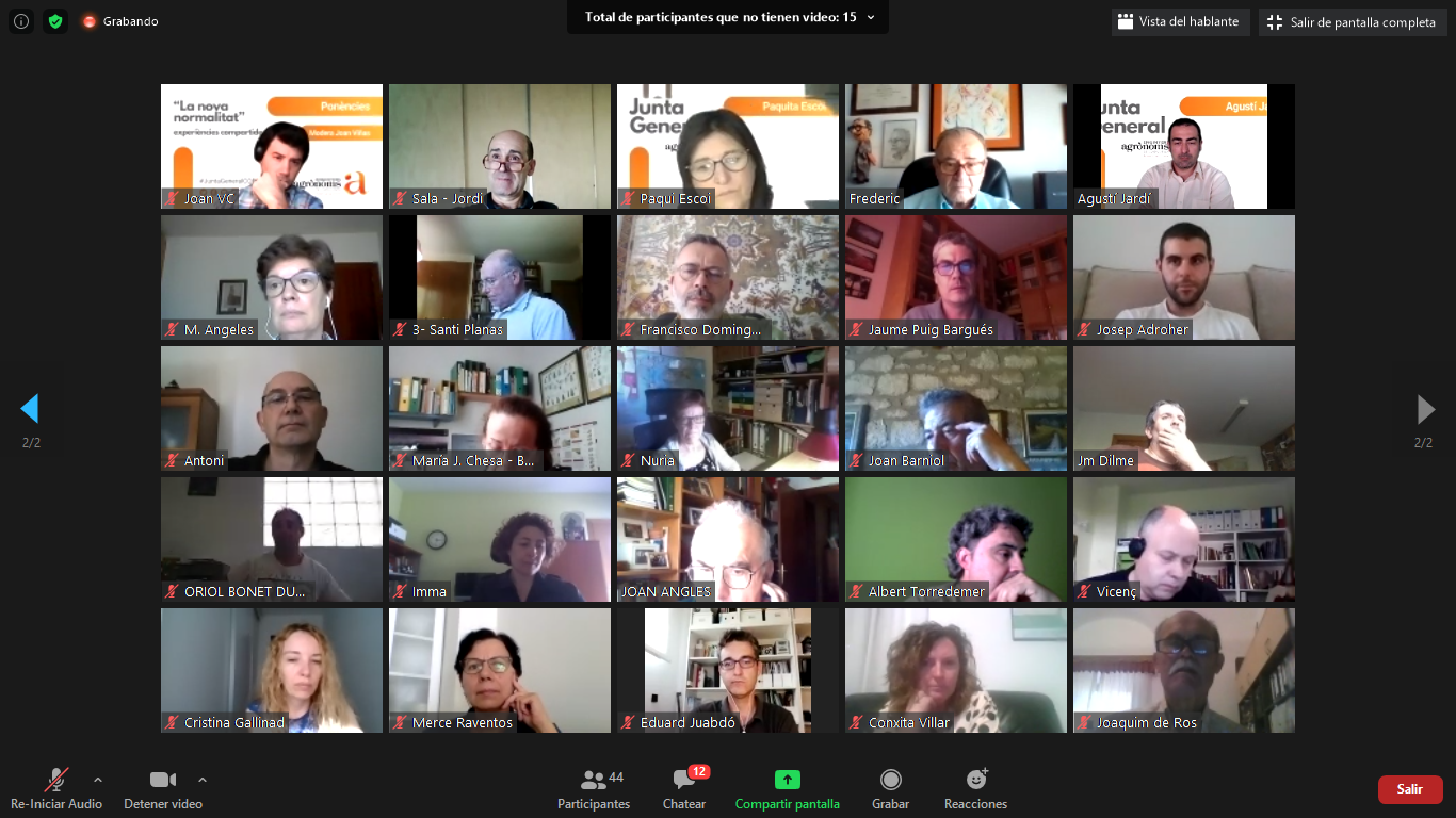 El divendres 5 de juny va tenir lloc la Junta/Assemblea General del Col·legi/Associació d’Enginyers Agrònoms, en un format adaptat al context que vivim degut a la crisi sanitària pel COVID19. Per aquest motiu, es va convocar a les 18.00h als col·legiats/des i associats/des per a realitzar una reunió de Junta/Assemble General on-line amb una xerrada posterior de la mà del company Josep Ma Franquet que va agradar molt als participants a l’acte.