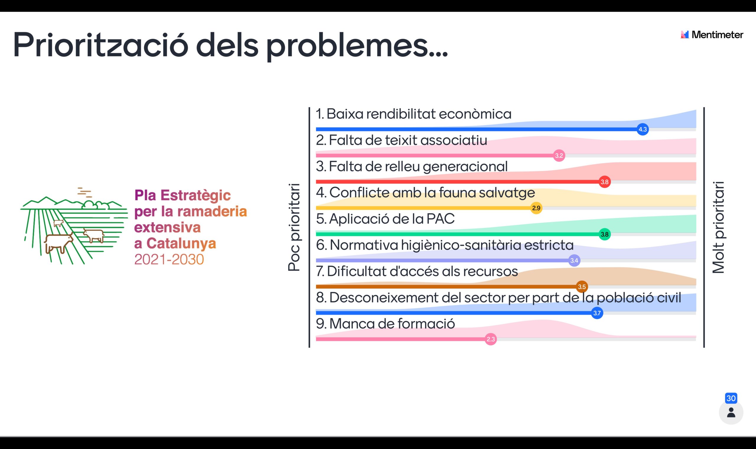 El dia 20 de setembre de 2021 es va iniciar el Procés participatiu per elaborar el PLA ESTRATÈGIC DE LA RAMADERIA EXTENSIVA A CATALUNYA (PEREC). Podeu visualitzar el video de la sessió clicant aquí. Us deixem la priorització dels problemes que es va fer durant la sessió: